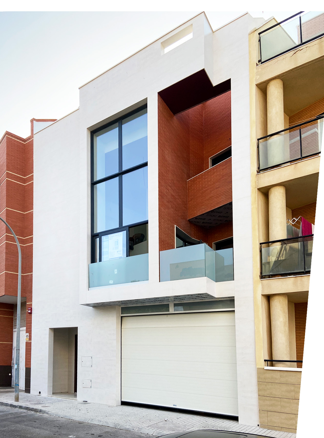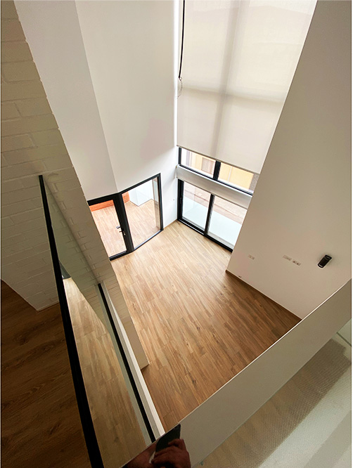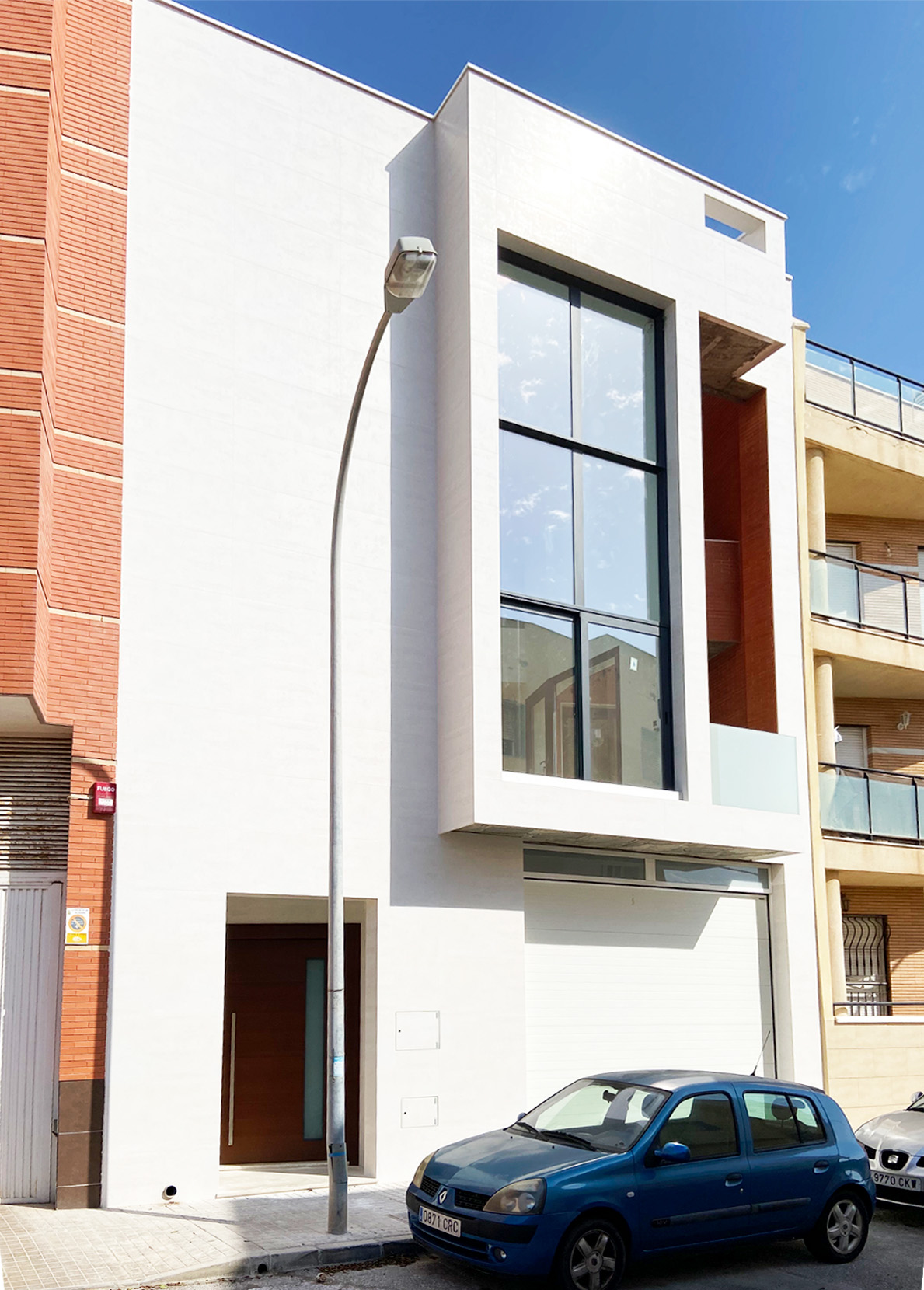 Inserta en una trama urbana consolidada, esta vivienda busca pasar desapercibida, pero con una personalidad muy definida. Destaca la fachada de un blanco impoluto que contrasta con los patios abiertos a fachada de ladrillo visto, como si fuera una herida que nos deja ver un interior que permanecía hasta ahora oculto. Y es que el interior no es menos sorprendente, destacando el amplio salón a doble altura con una gran vidriera que funciona a la perfección como mecanismo bioclimático.