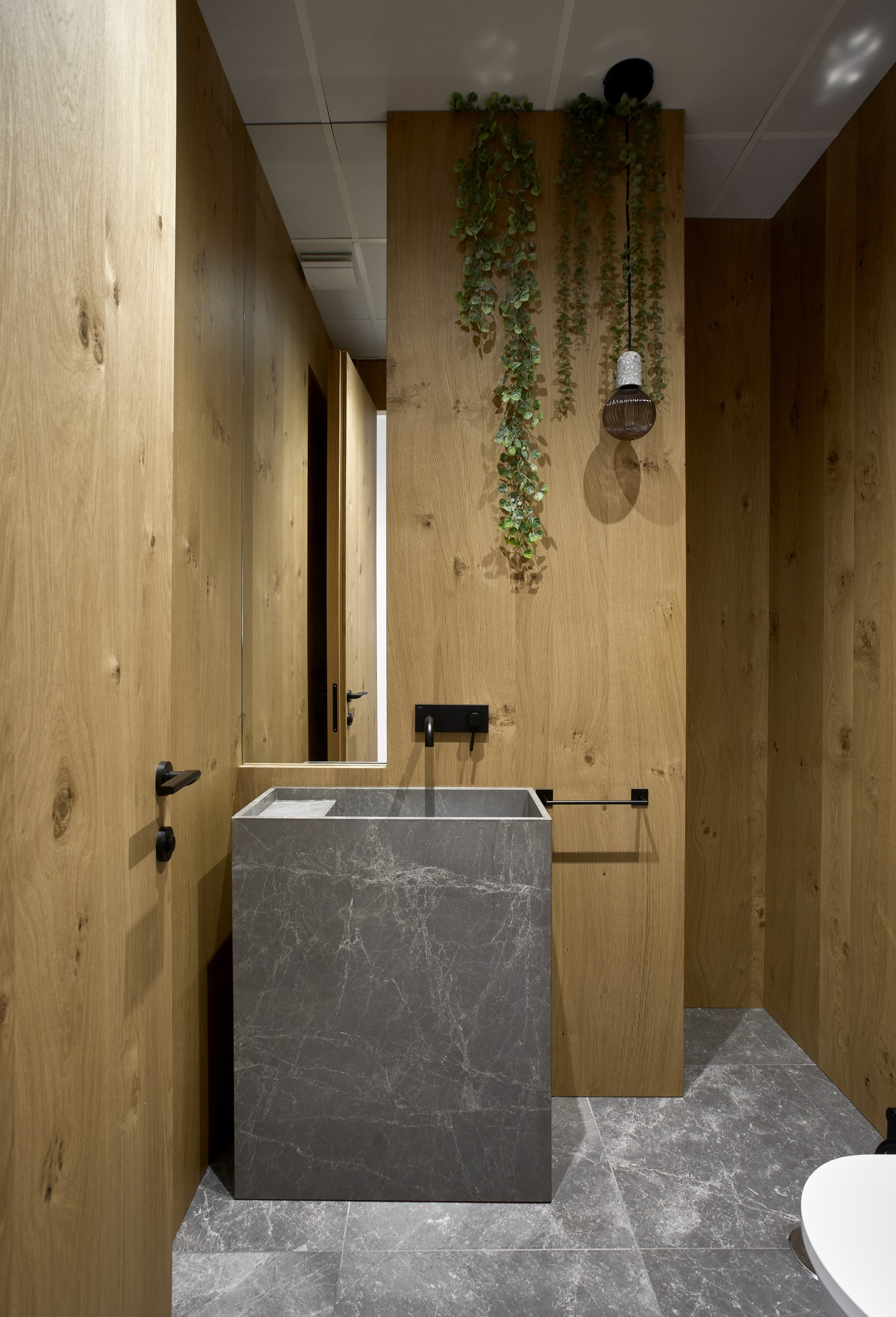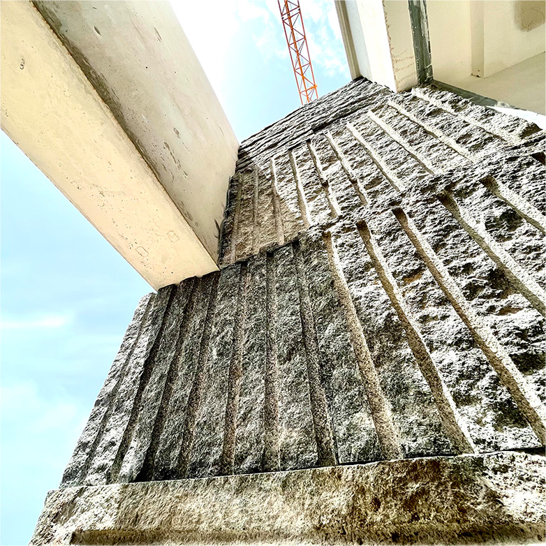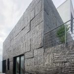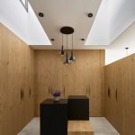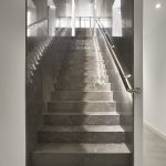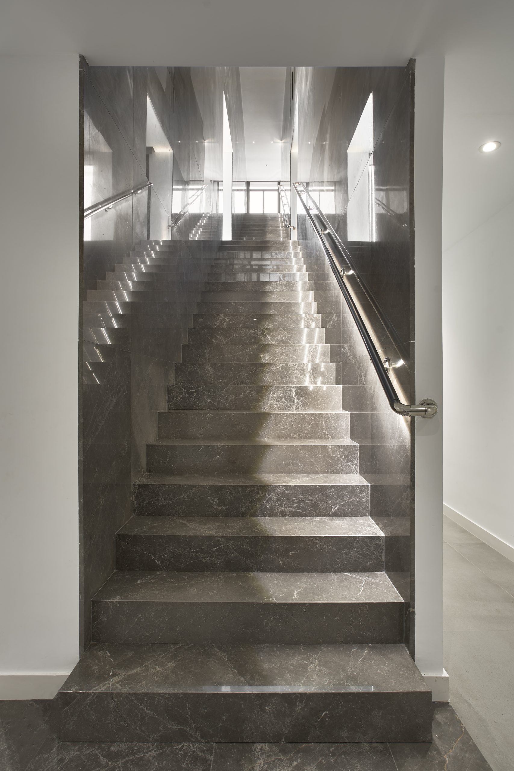 Su espectacular escalera de tres alturas, atraviesa todo el espacio como una grieta producida por fuerzas tectónicas en la roca.