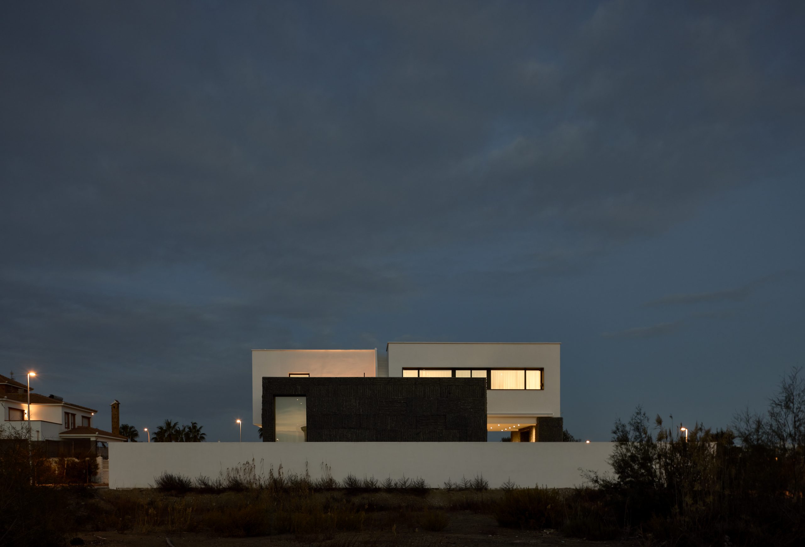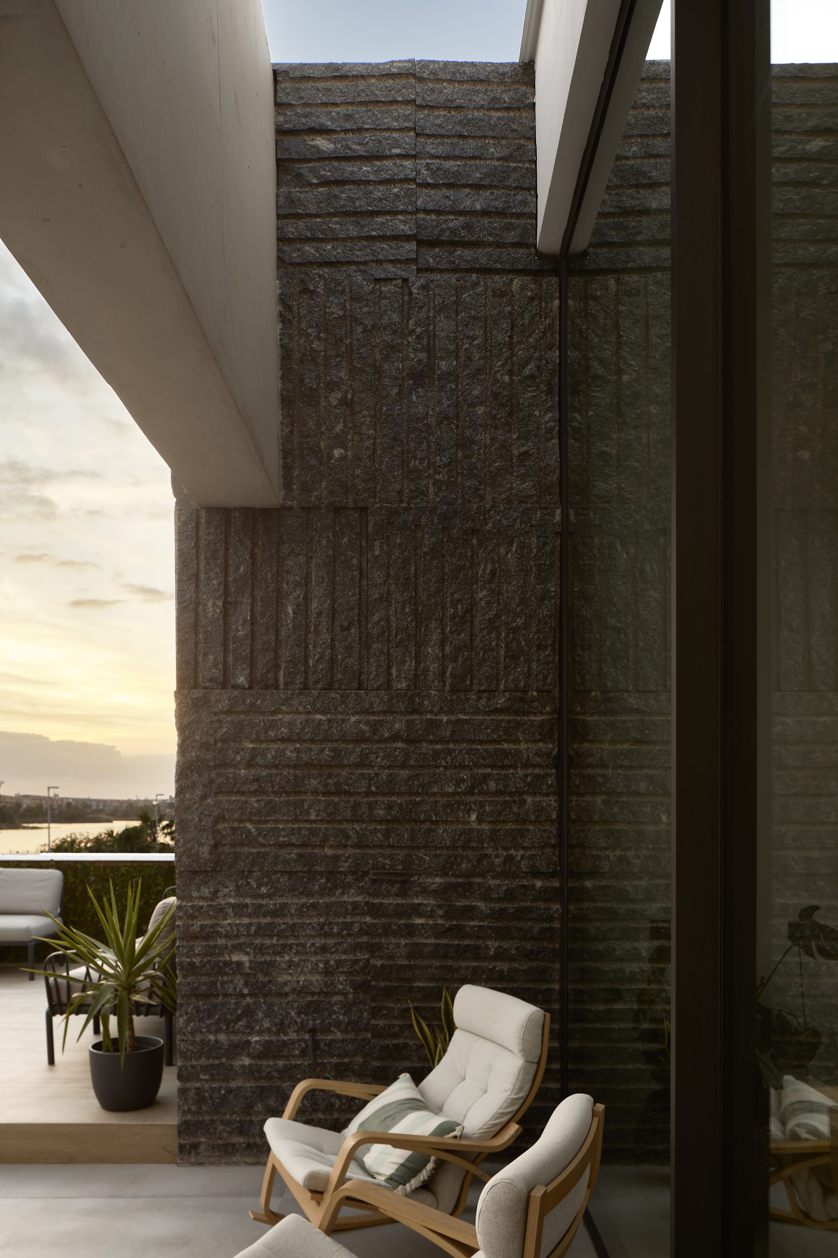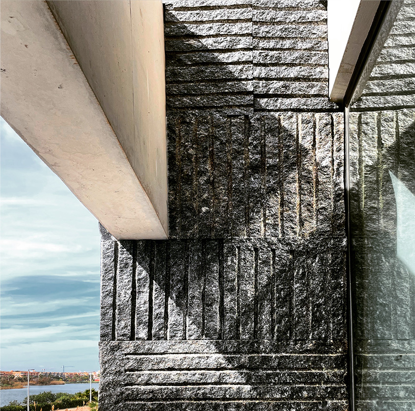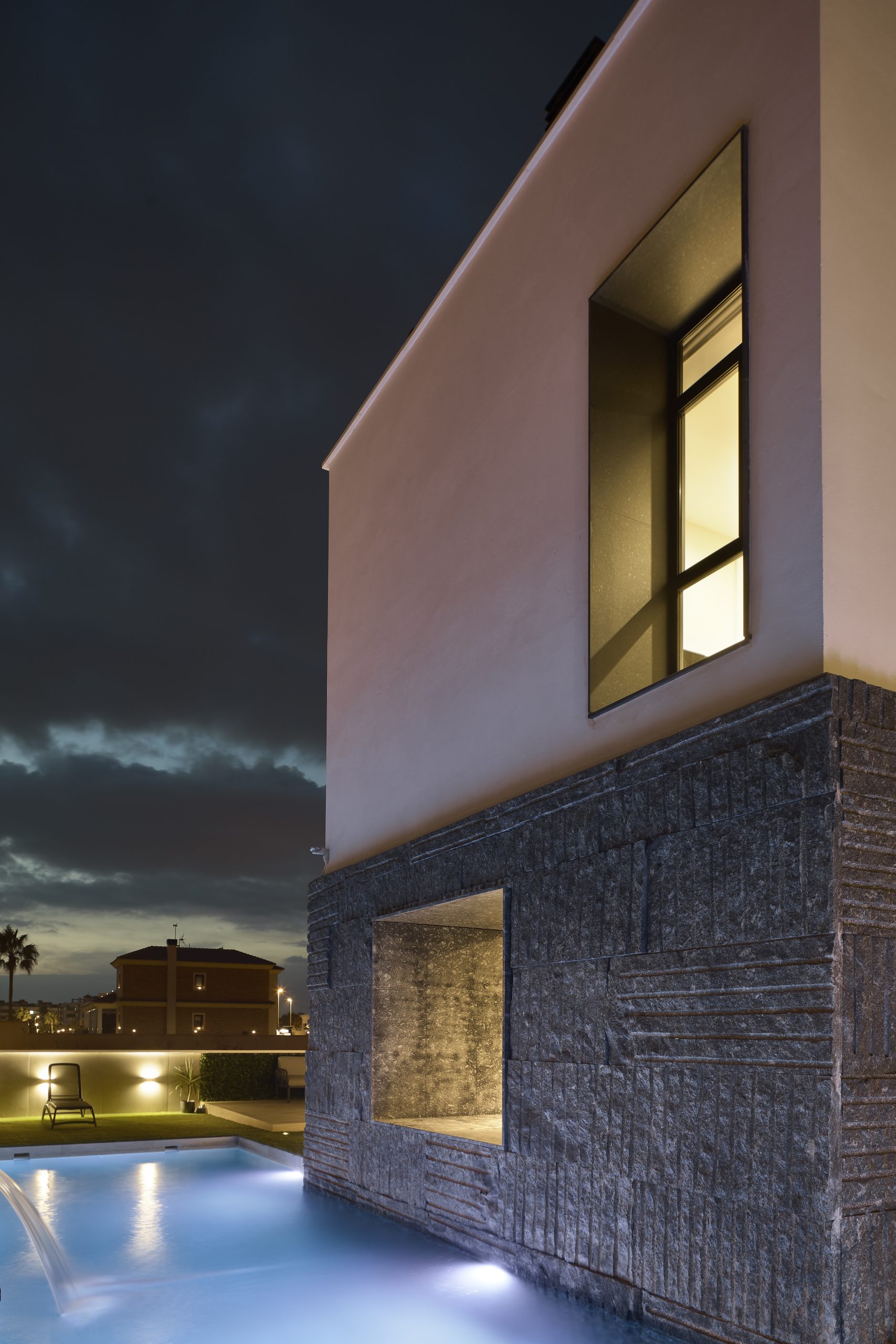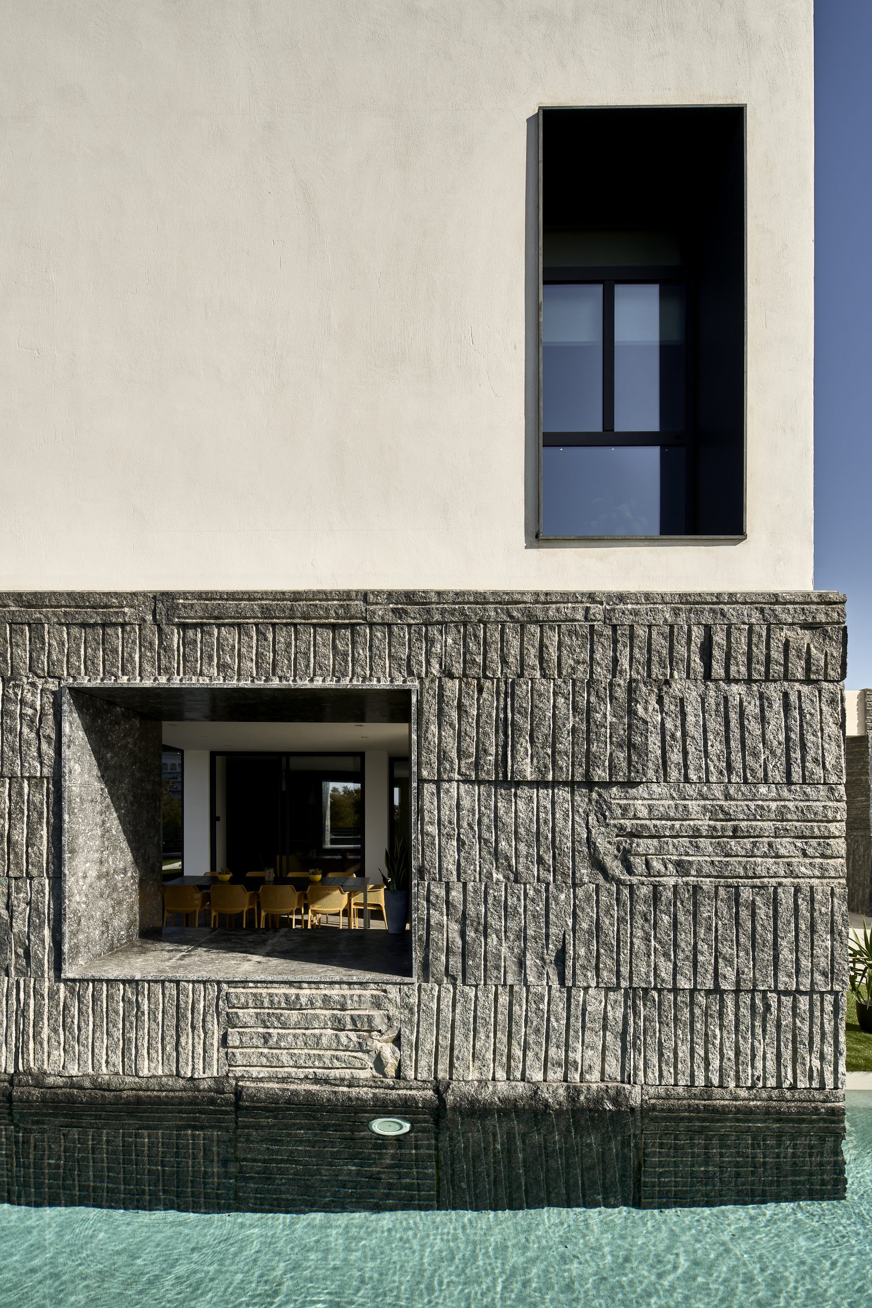 En primera línea de lago, con unas vistas impresionantes que son el motor de la propuesta, proyectamos esta vivienda absolutamente abierta al sur mediterráneo, lo que contrasta con el material granítico y cerrado del resto de la fachada, que le proporciona su aspecto tan característico.