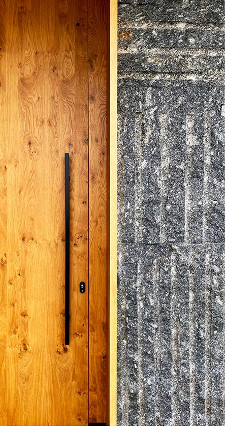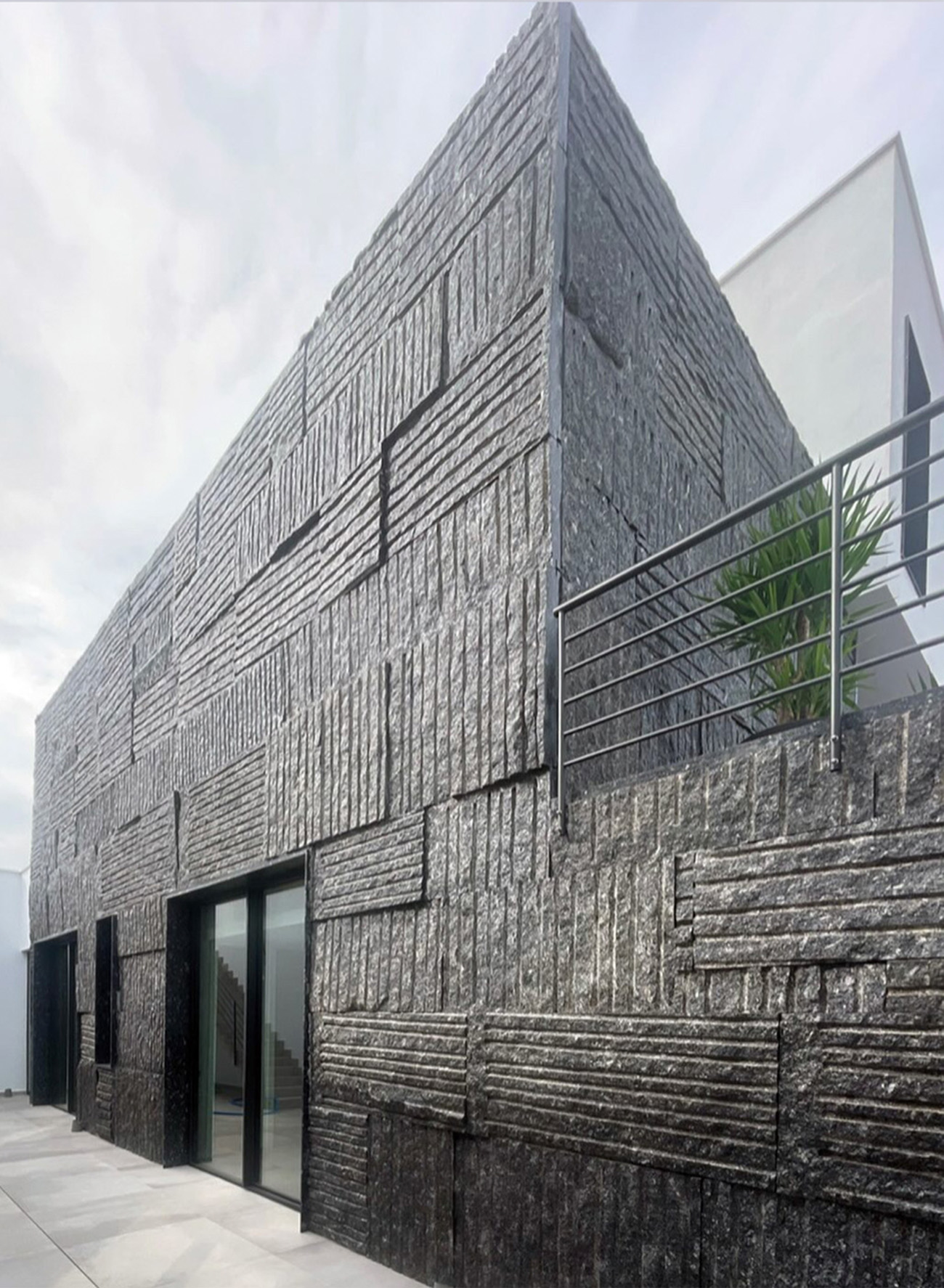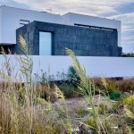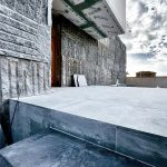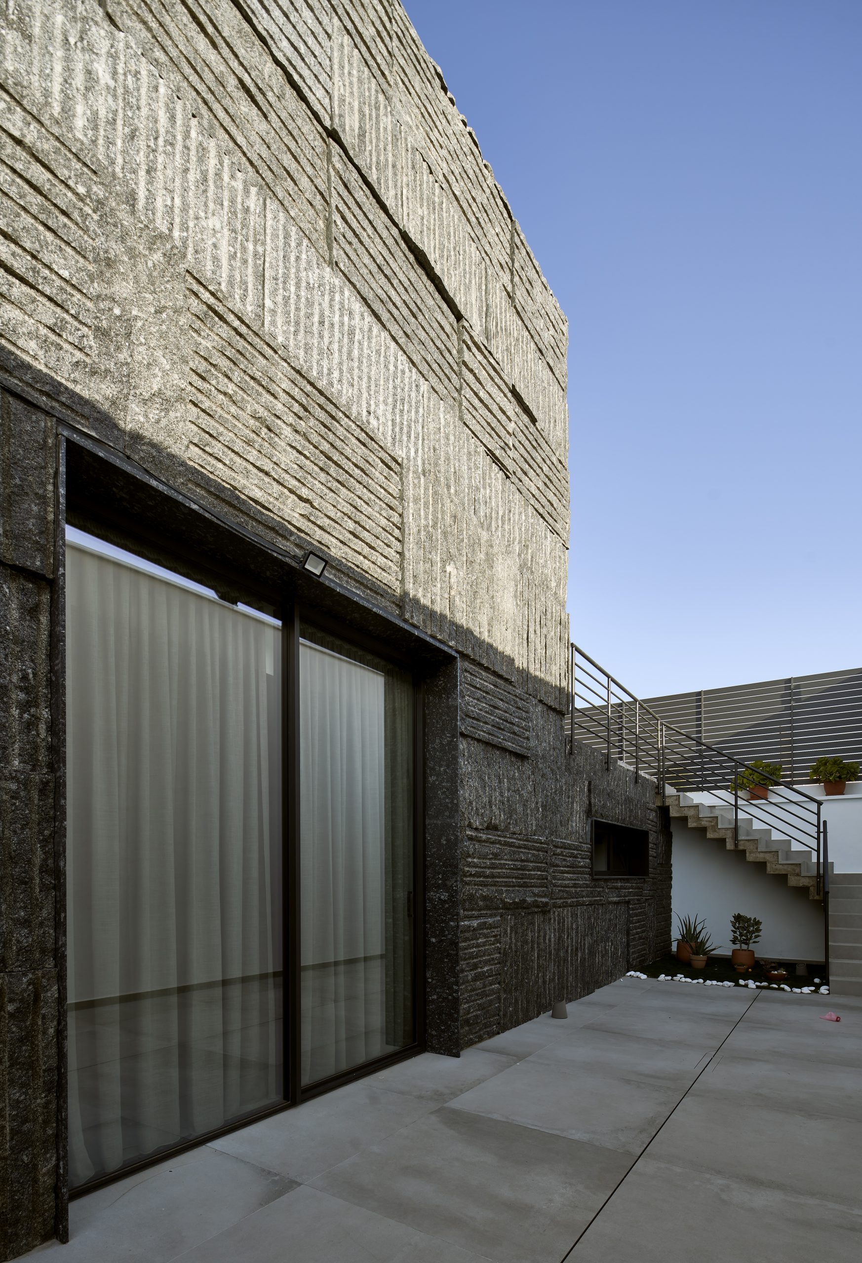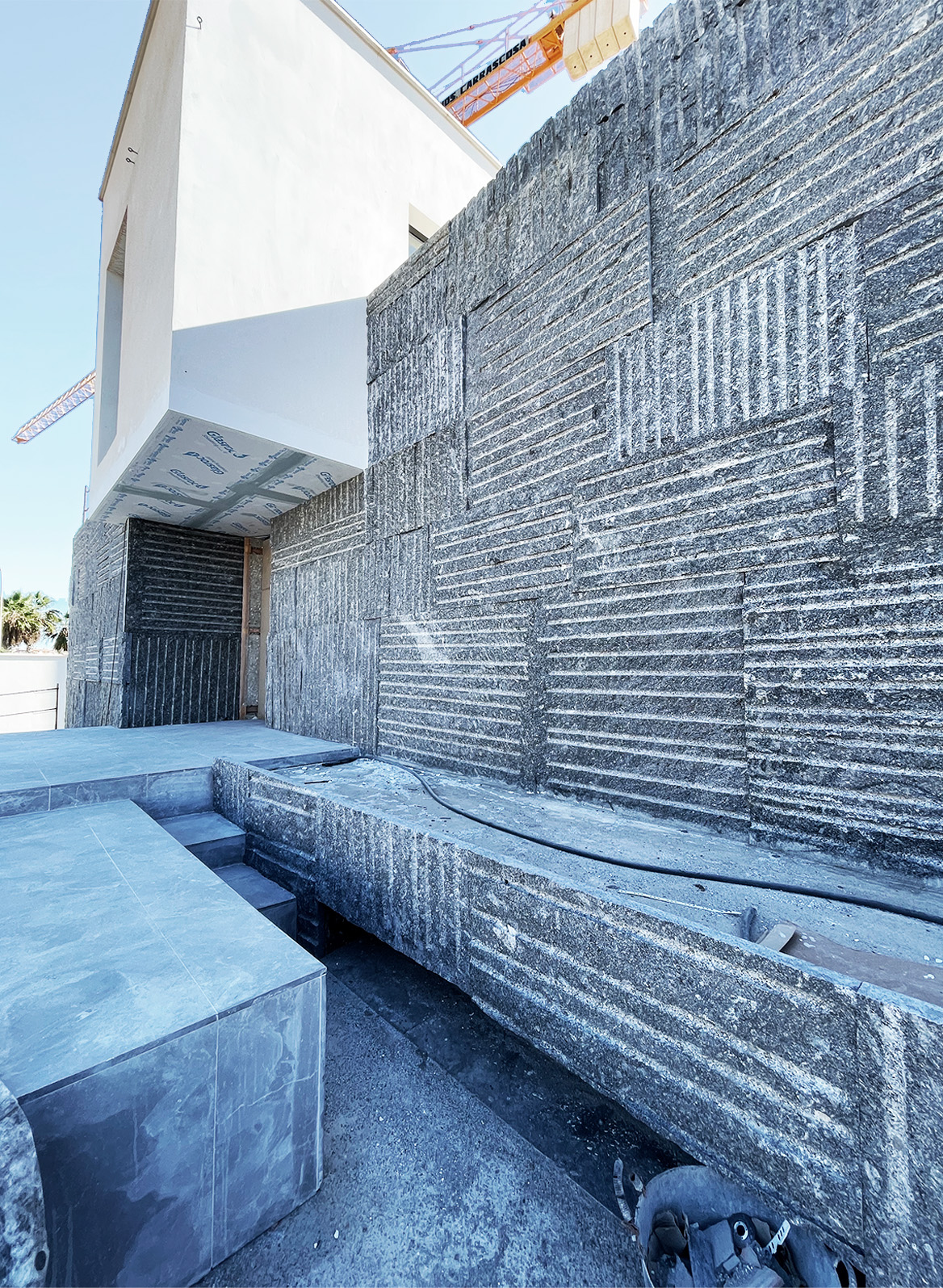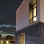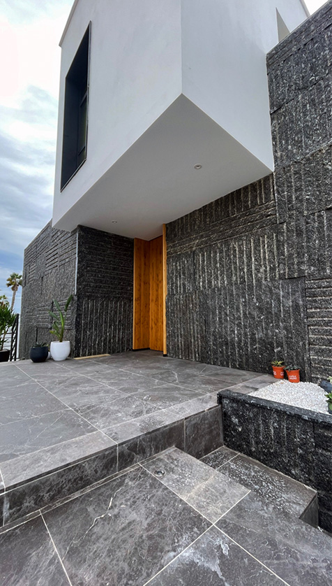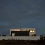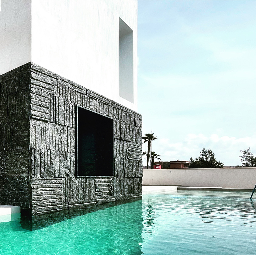 En primera línea de lago, con unas vistas impresionantes que son el motor de la propuesta, proyectamos esta vivienda absolutamente abierta al sur mediterráneo, lo que contrasta con el material granítico y cerrado del resto de la fachada, que le proporciona su aspecto tan característico.
